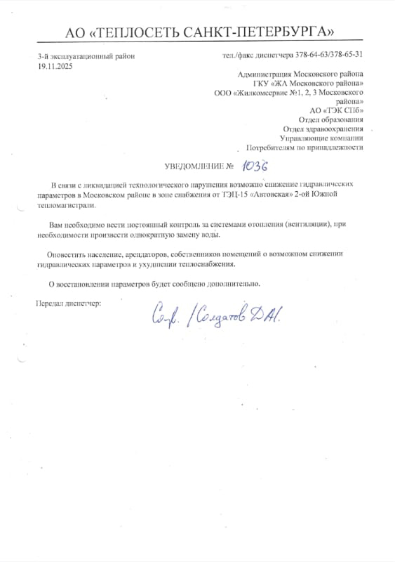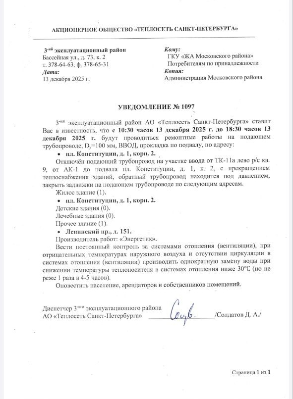| Уважаемые собственники и жители! Доводим до вашего сведения, что согласно телефонограмме (Уведомление № 1097) от АО «Теплосеть Санкт-Петербурга», будут проводиться аварийные работы на подающем трубопроводе. В связи с этим будет прекращена подача теплоснабжения (отопления) по следующим адресам: пл. Конституции, д. 1, корп. 2 Ленинский пр., д. 151 Время проведения работ: 13 декабря 2025 г. с 10:30 до 18:30 С уважением, Правление ТСЖ «Ньютон» |